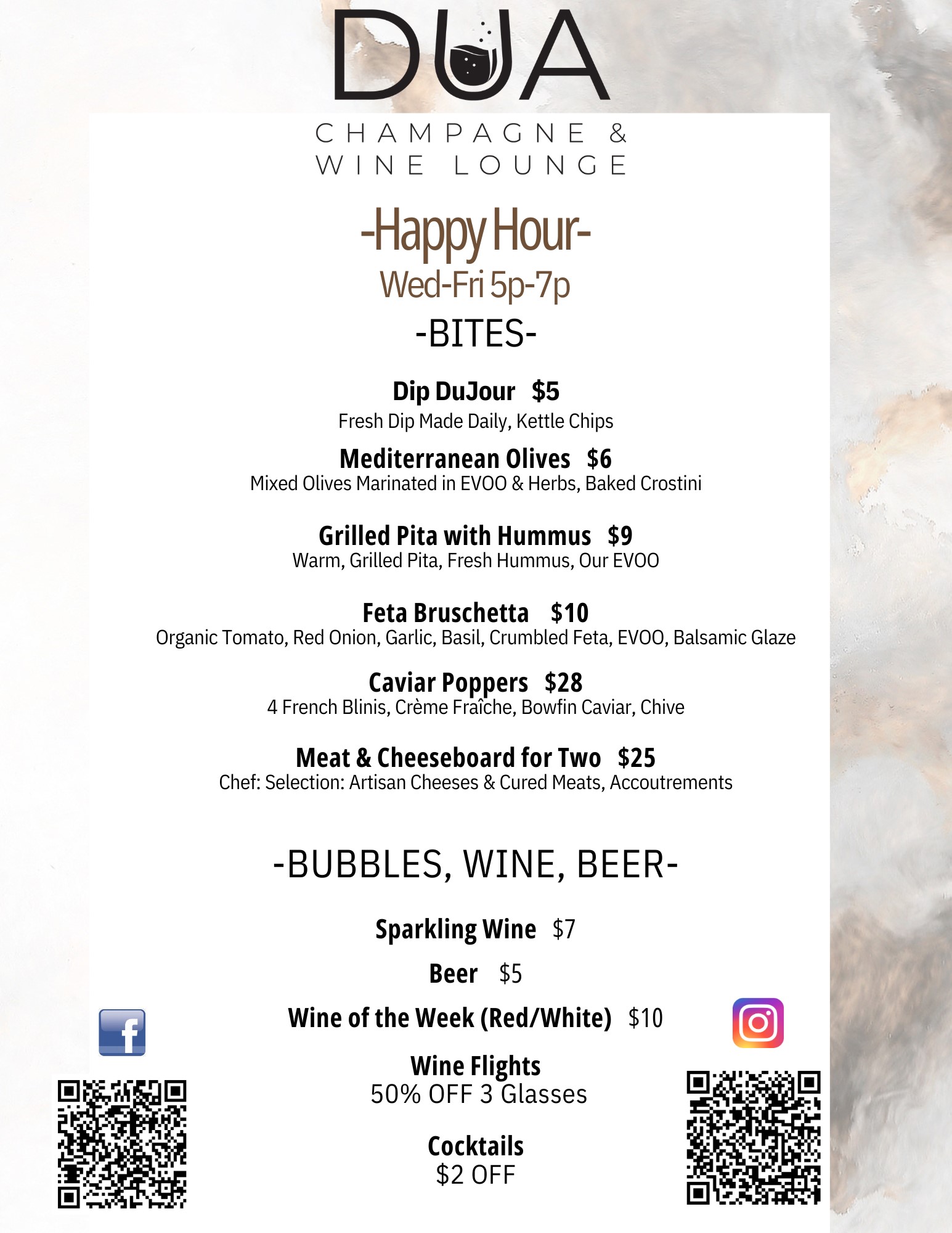 Dua is an intimate champagne and wine bar specializing in caviar, small plates, cheese and charcuterie boards, fine wines and champagnes. Join us for happy hour from 5p-7p on Wednesdays through Friday! Check us out on special weekends for live DJ entertainment with late night music and dancing, as well as Wine Tasting events monthly.